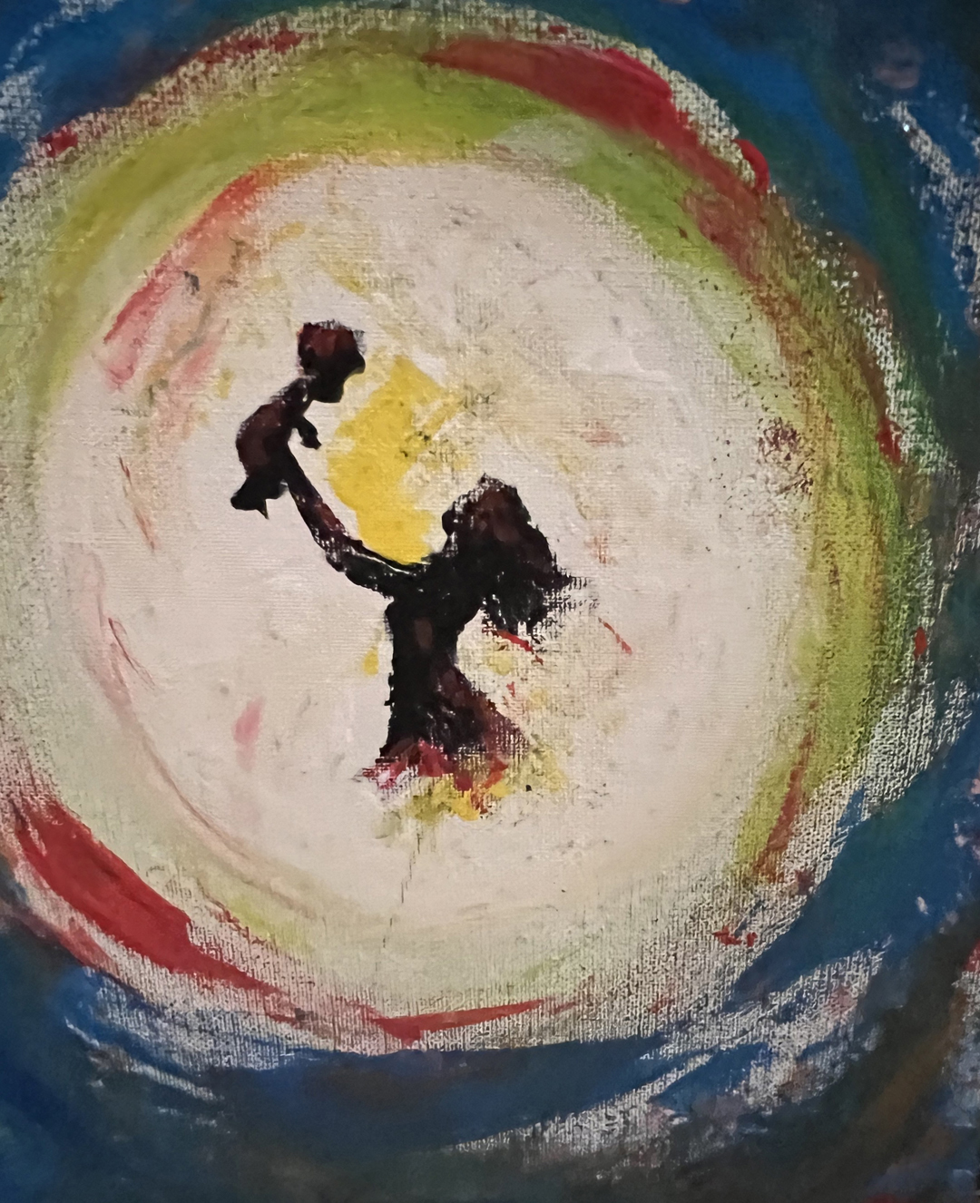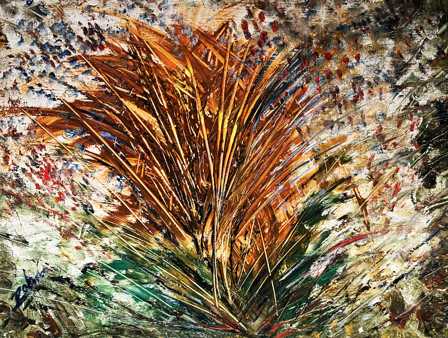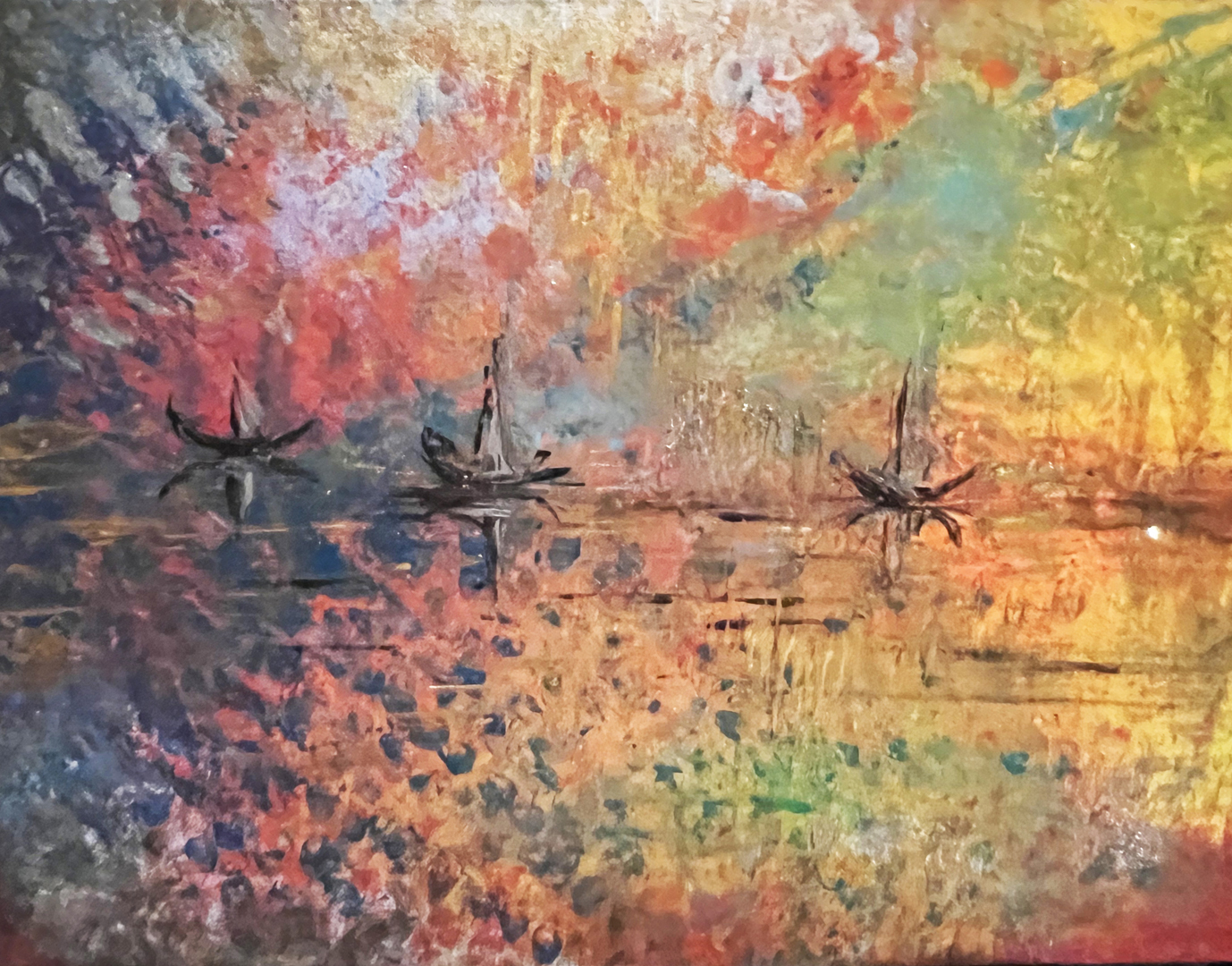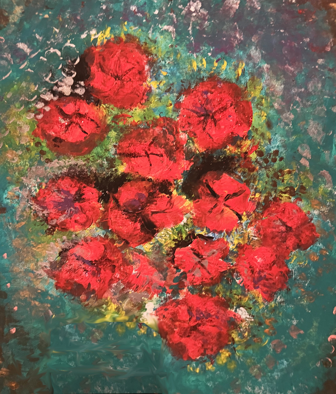 One of my techniques with some of my acrylic paintings is to pour the colours randomly onto the canvas and then move the canvas in a rotational fashion to mix the colours, then use a hair dryer to apply heat while blowing the paint. This allows for additional mixing of the colours where they randomly flow giving it a sense of movement.