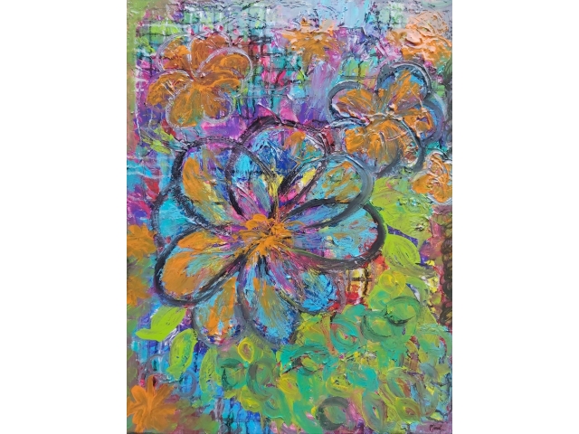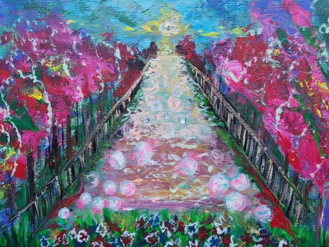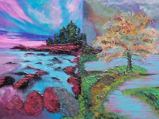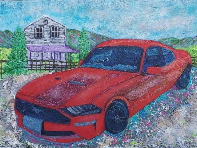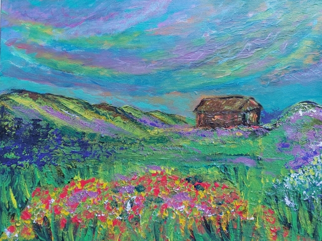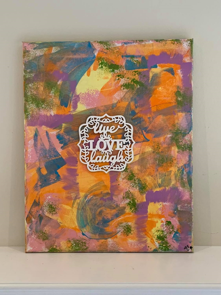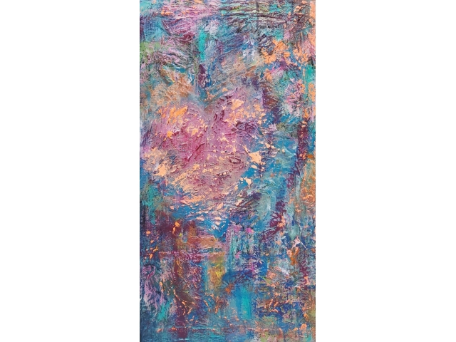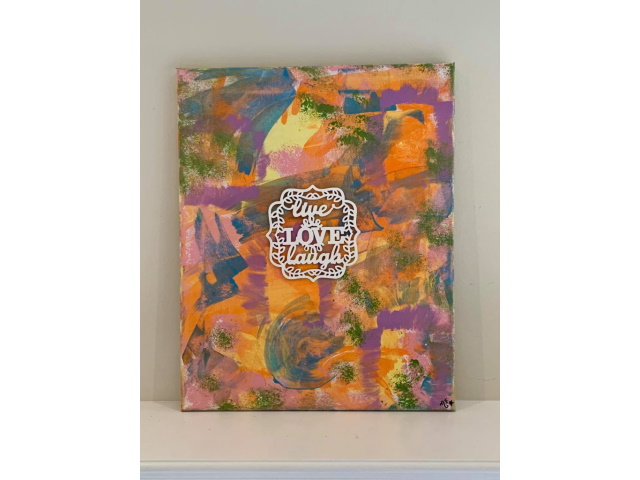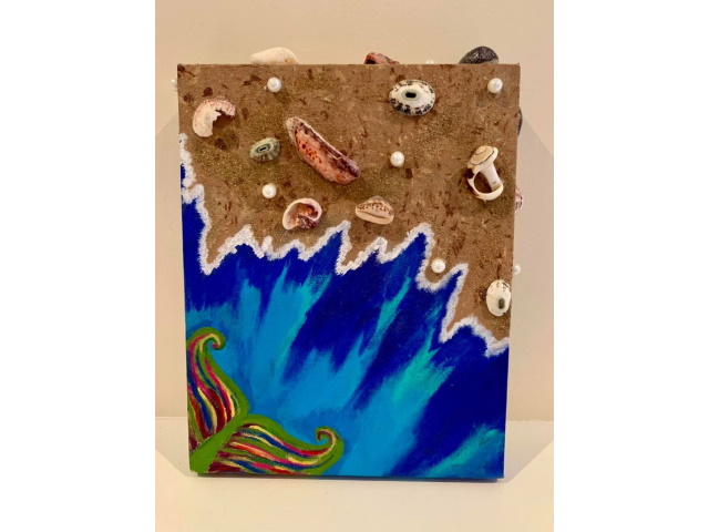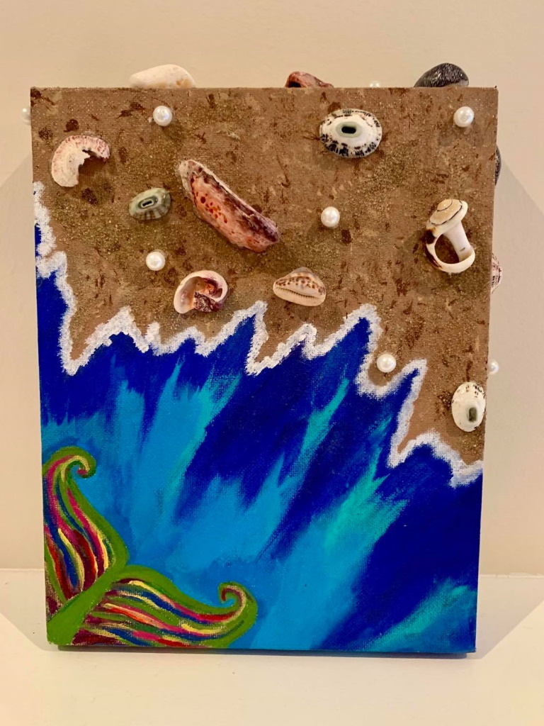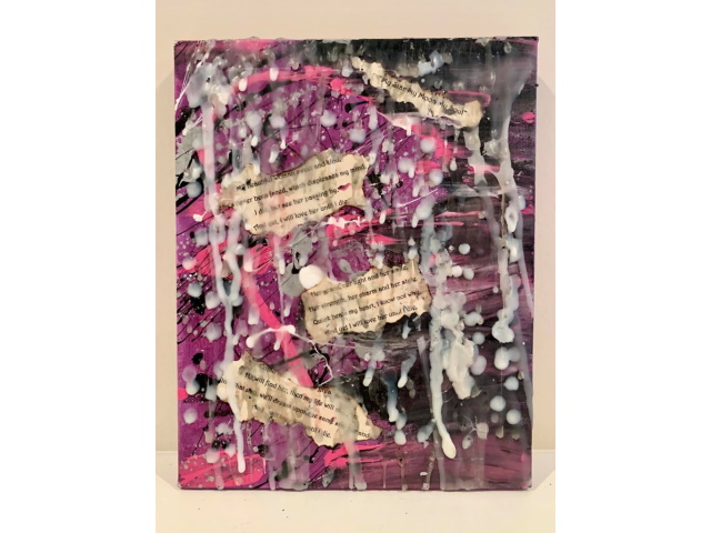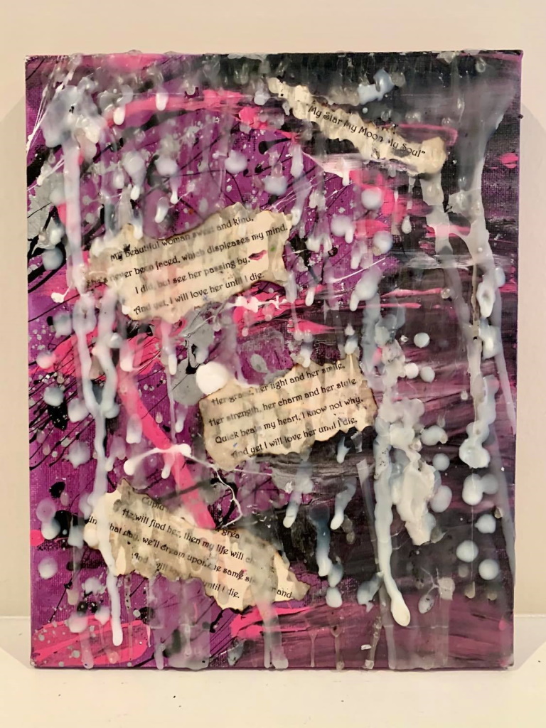 In my paintings, I enjoy working with acrylic paint the most and incorporating many forms of mixed media into my pieces. I like to experiment! I work with canvas a lot but have also been known to create many works out of recycled materials. I love how you can take a plain old piece of plywood from an old shelf or a piece of furniture and turn it into a beautiful piece of art! I also like to include a piece of poetry on the back of each one, giving the viewer insight into each piece, what it is about and what inspired it.