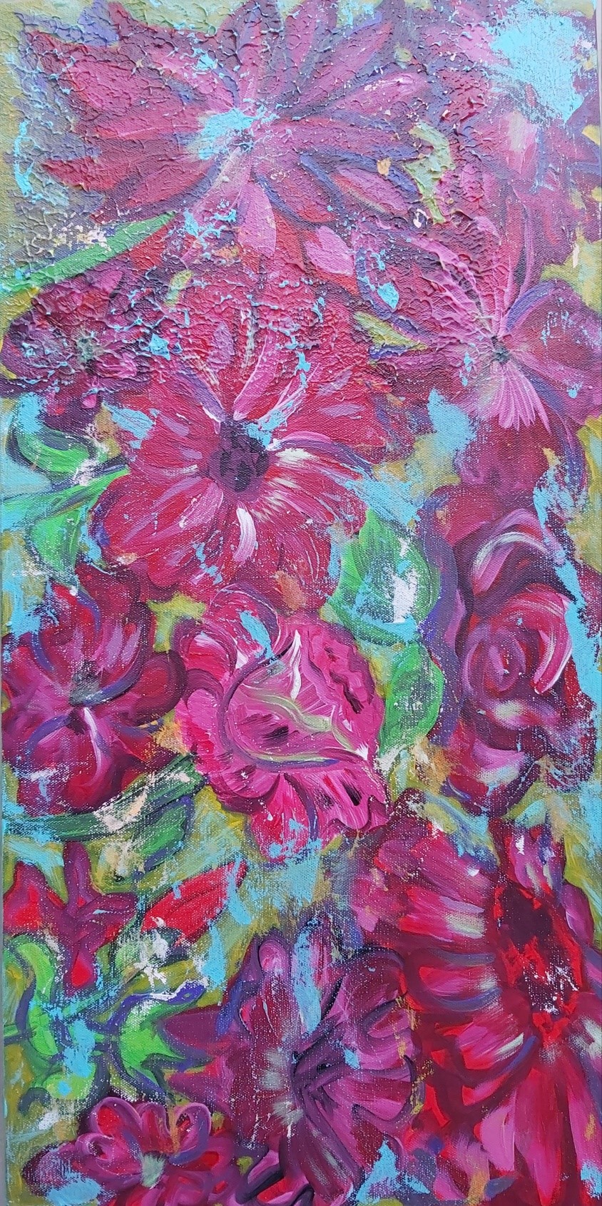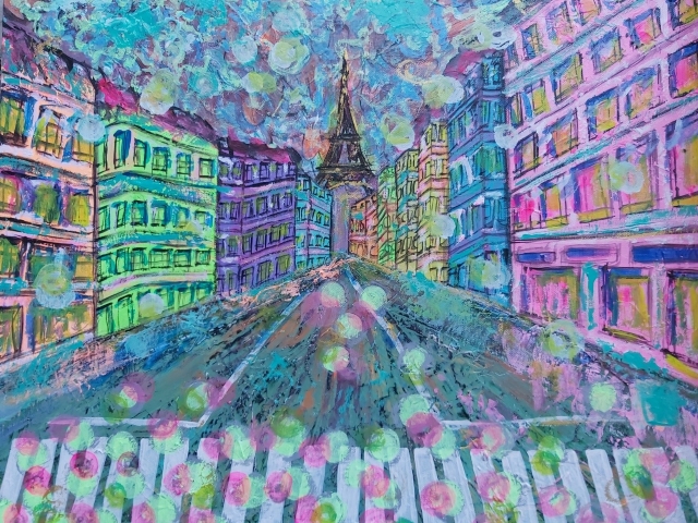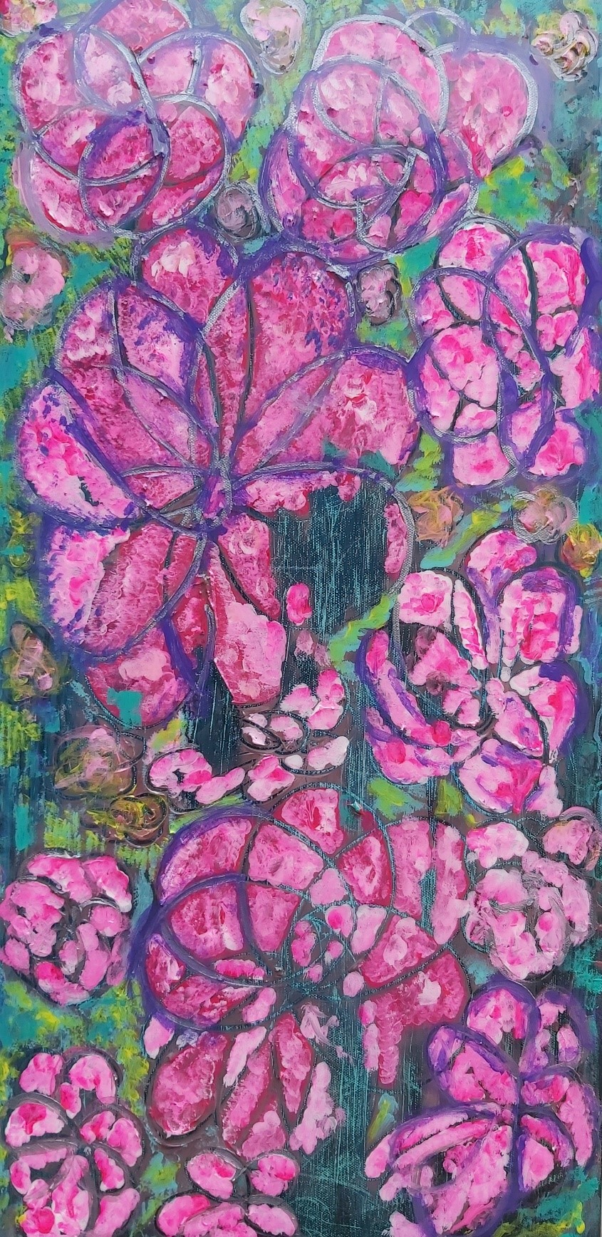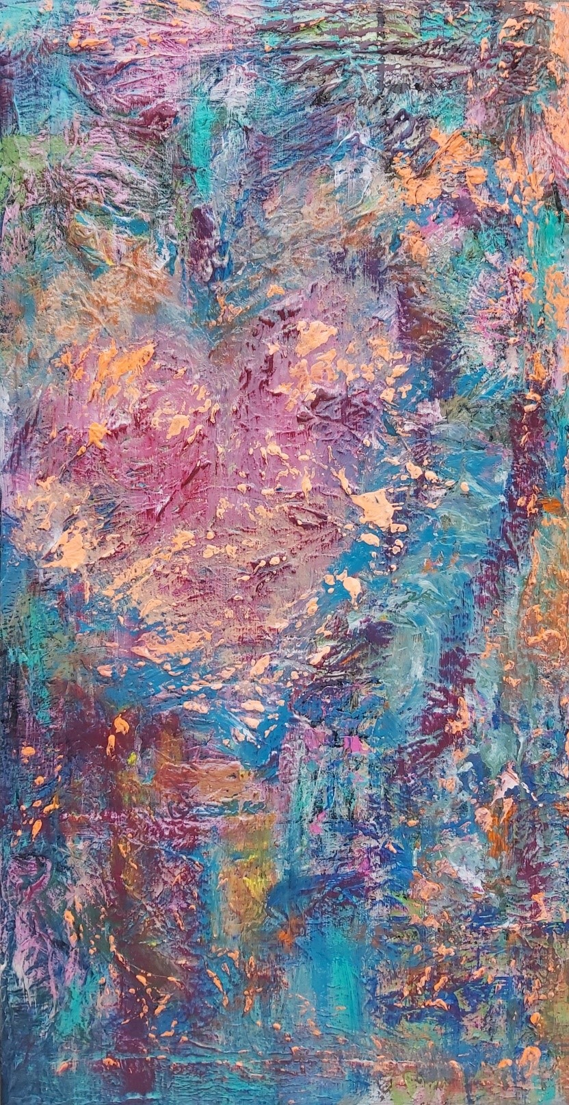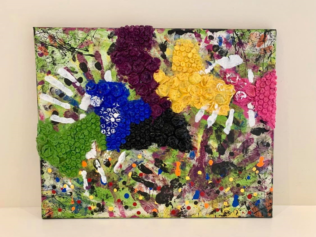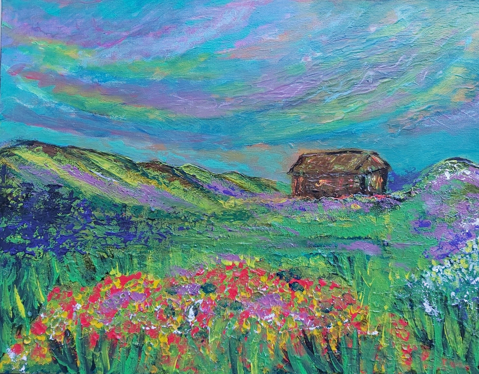 In my paintings, I enjoy working with acrylic paint the most and incorporating many forms of mixed media into my pieces. I like to experiment! I work with canvas a lot but have also been known to create many works out of recycled materials. I love how you can take a plain old piece of plywood from an old shelf or a piece of furniture and turn it into a beautiful piece of art! I also like to include a piece of poetry on the back of each one, giving the viewer insight into each piece, what it is about and what inspired it.